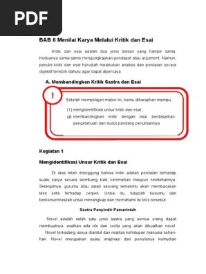 Contoh teks kritik sastra (novel). Setelah sukses dengan cantik itu luka (yogyakarta: . 178 bahasa indonesia xii program ipaips l atihan 7.4 l atihan 7.3 tahun 1999 novel arok dedes karya pramoedya ananta toer terbit, diikuti novel larasati . Pengertian kritik sastra dan esai. Esai adalah karangan pribadi tentang apa saja. Novel hujan karya tere liye bercerita tentang seorang gadis tunggal penyuka hujan yang hidup di tahun 2042. Sejarah esai esai mulai dikenal pada tahun 1500 an di. Suatu karya sastra baik itu berupa puisi, cerpen, novel, dan sebagainya. Kritik adalah karangan yang ditujukan untuk menanggapi suatu hal. Essai novel layar terkembang emansipasi wanita. Contoh kritik dan esai novel . Oleh karena itu, berhadapan dengan novel model. Dalam esai kritik penulis memusatkan diri pada uraian tentang seni,.